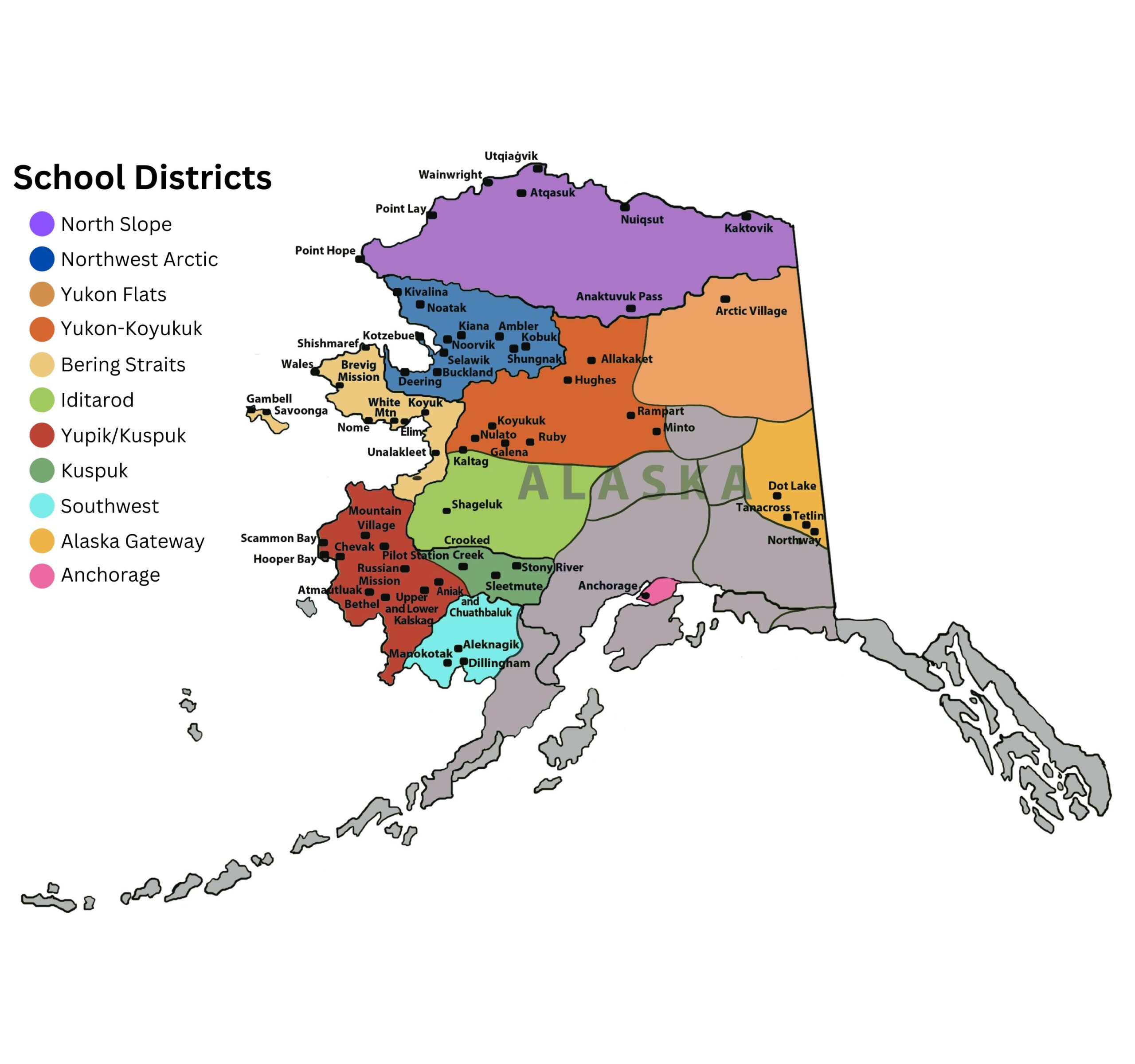 NANA region: Ambler, Buckland, Deering, Kiana, Kivalina, Kobuk, Kotzebue, Noatak, Noorvik, Selawik, Shungnak